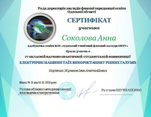 27 листопада студентка групи 2КБ-05 Соколова Анна, під керівництвом викладача теорії електричних та магнітних кіл Жупанова Івана Анатолійовича, взяла участь у IV Обласній...