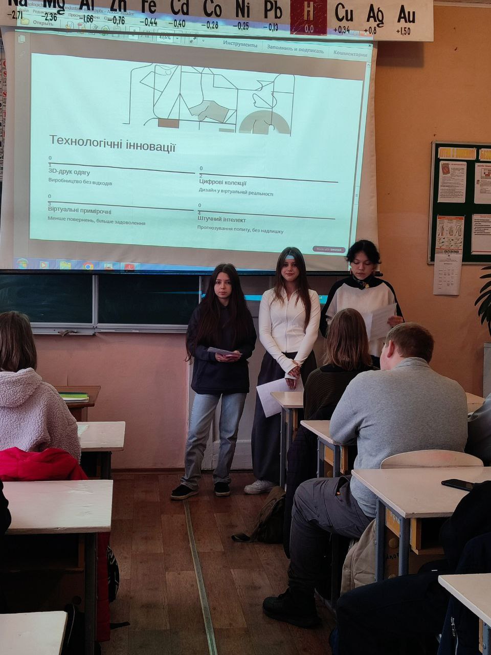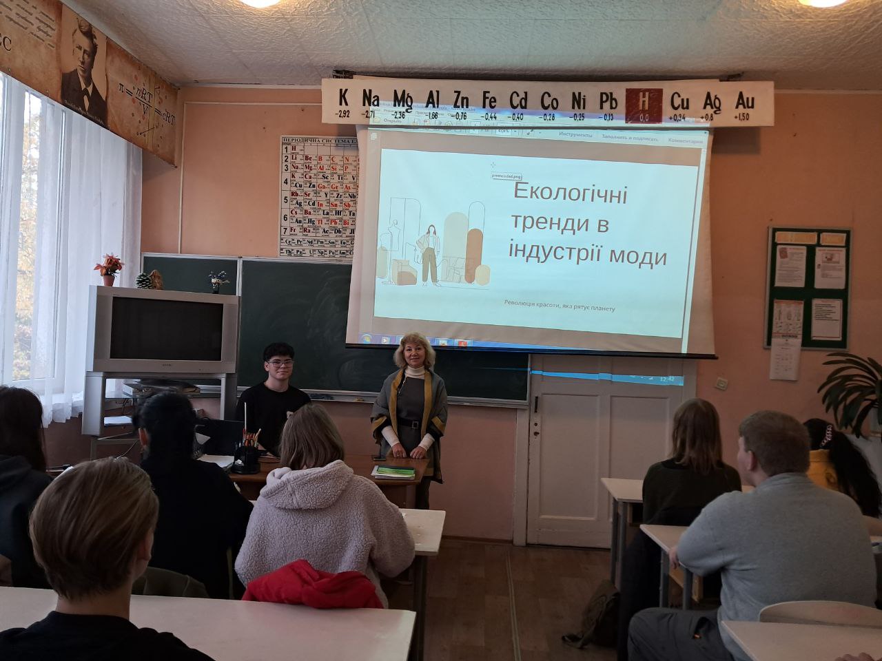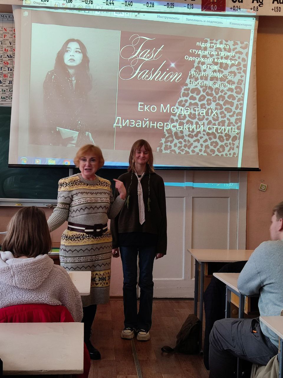 05.11.2025 року викладачі комісії Харчових технологій та хімії Девятьярова Л.І., Дьякова Т.В., Швець Л.І. провели класну годину на тему "Екологічні тренди в індустрії моди" для здобувачів освіти груп 1ім-08, 1тх-82, 2гх-04. Підготували матеріали студенти групи 2мк-24 Бабенко І., Габрилевич Ю., Дмитроняк С., Чебан В.