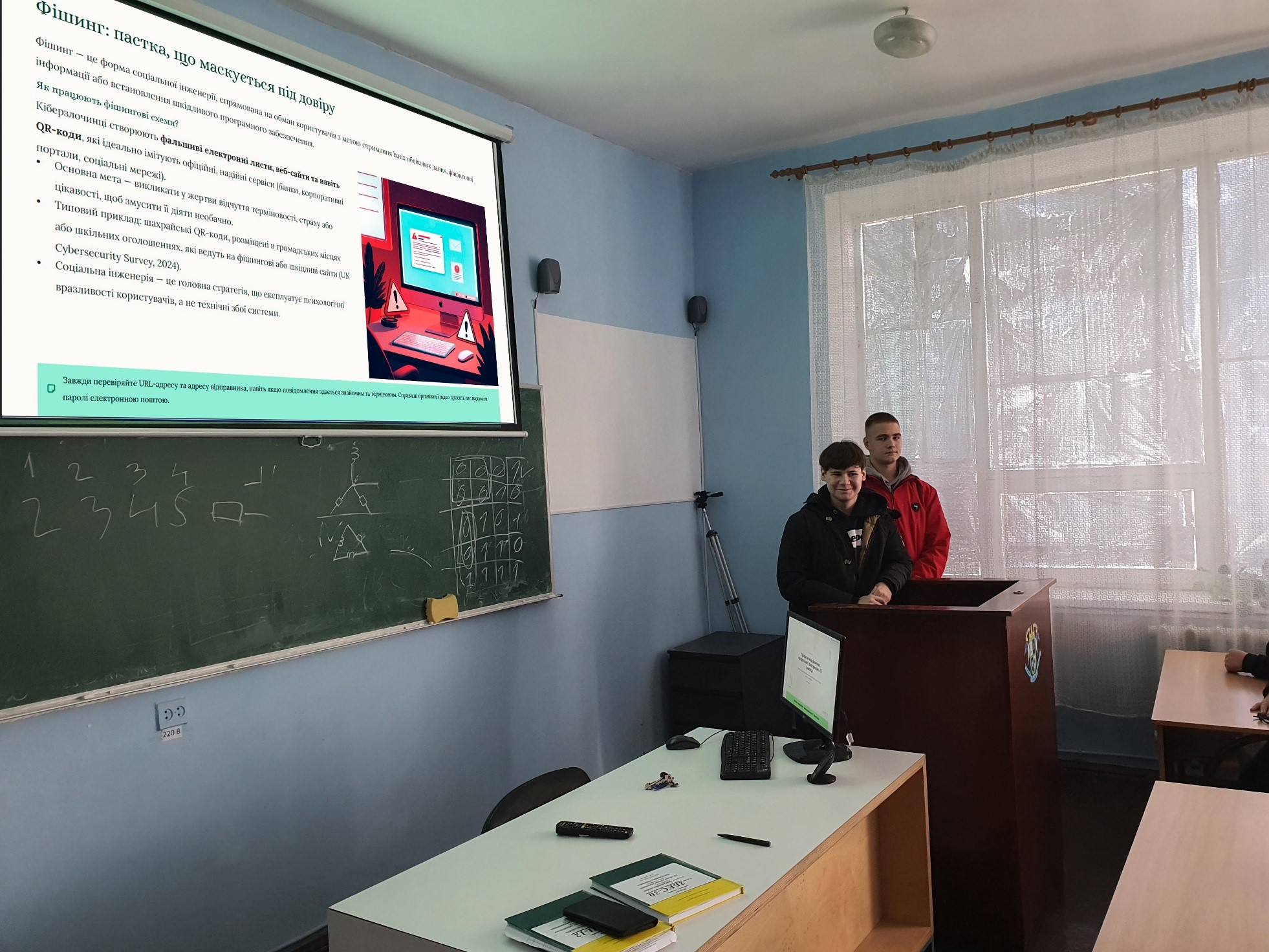 14 січня 2026 року викладачами циклової комісії КТ та ПІ Кривченко Ю.В. та Стогулом В.М. було проведено майстер-клас «Підвищення обізнаності про кібербезпеку у інтернет: захист від фішингу та шкідливого ПЗ» для здобувачів освіти перших курсів відділення комп’ютерних систем. Під час заходу студенти ознайомилися з актуальними загрозами у цифровому середовищі, дізналися про найпоширеніші методи фішингових атак та способи їх розпізнавання. Викладачі продемонстрували практичні приклади небезпечних листів та сайтів, пояснили принципи роботи шкідливого програмного забезпечення та надали поради щодо безпечної поведінки в інтернеті. Особливу увагу було приділено правилам створення надійних паролів, використанню двофакторної автентифікації та важливості регулярного оновлення програмного забезпечення. Майстер-клас пройшов у інтерактивній формі: студенти активно ставили запитання, аналізували реальні кейси та отримали корисні рекомендації для захисту власних даних. Захід став важливим кроком у формуванні цифрової грамотності та культури безпечного користування інтернетом серед здобувачів освіти 1 курсів.