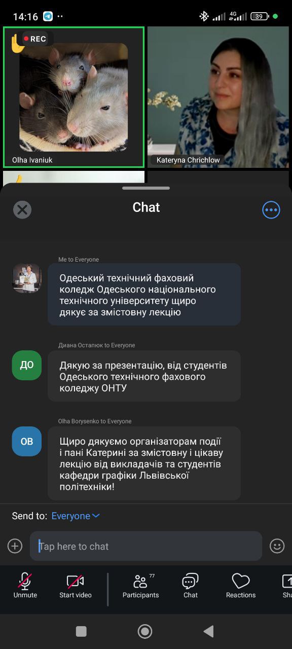 До лекції активно долучилися викладачі циклової комісії спецдисциплін легкої промисловості та студенти 3-4 курсів Одеського технічного фахового коледжу ОНТУ спеціальностей G15 Технології легкої промисловості (3МК-23/МІ-04, 4МК-22/МІ-03) та F7 Комп'ютерна інженерія (3КГ-10, 3КГ-12), які дізналися, як ШІ трансформує їхні майбутні професії та відкриває нові креативні горизонти.
