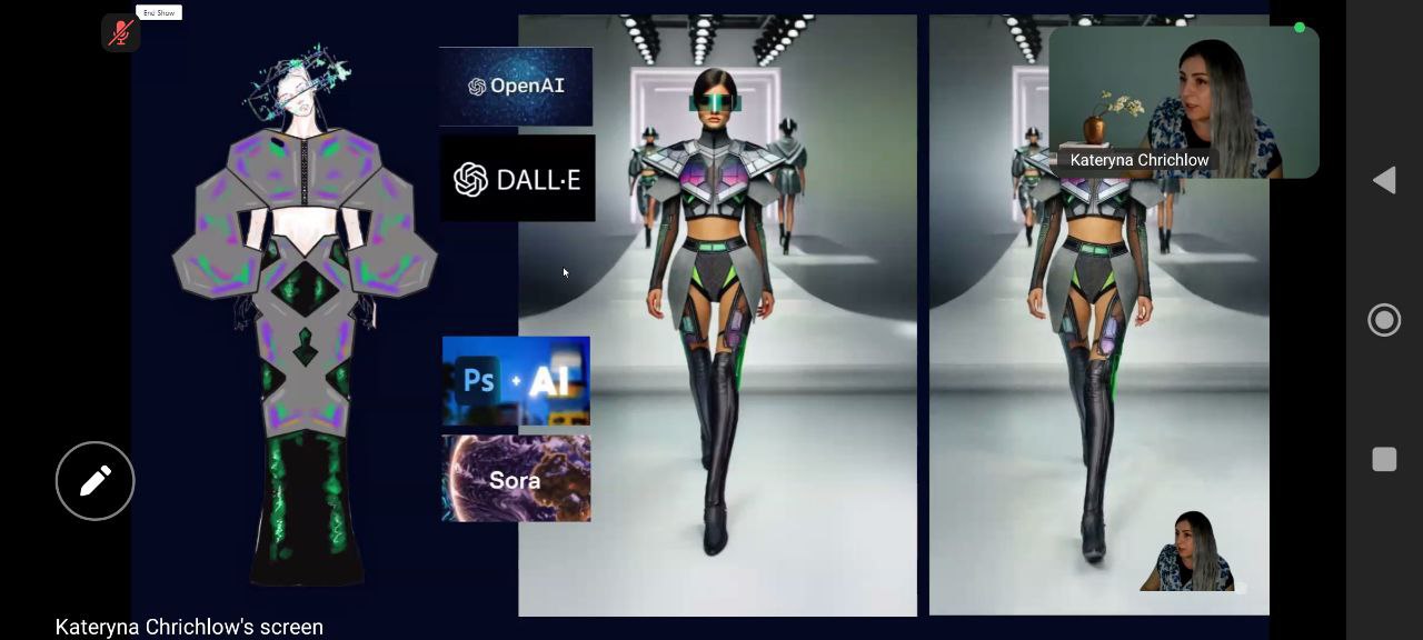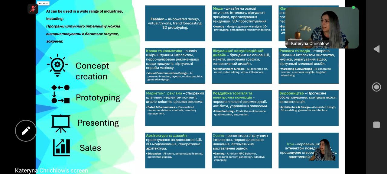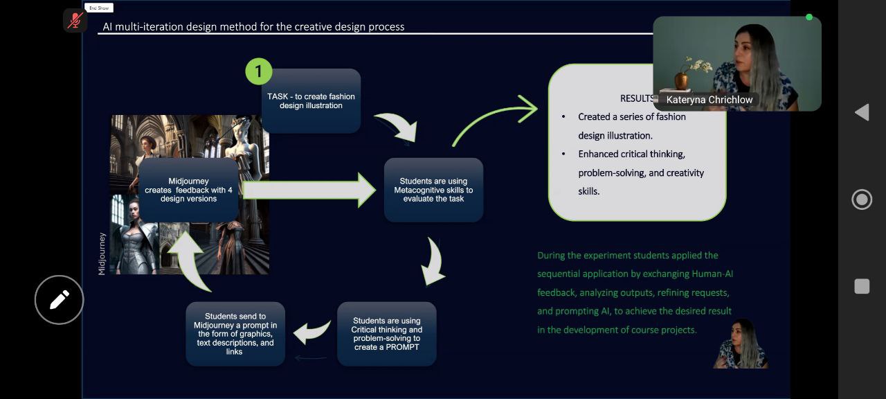 03 жовтня в рамках Тижня українського дизайну та інновацій Факультет дизайну КНУТД провів міжнародну онлайн-лекцію "Можливості використання Штучного Інтелекту в дизайні". Спікерка, Катерина КРІЧЛОУ з Birmingham City University, акцентувала на важливості вивчення ШІ як ключового інструменту для модернізації та інновацій.
