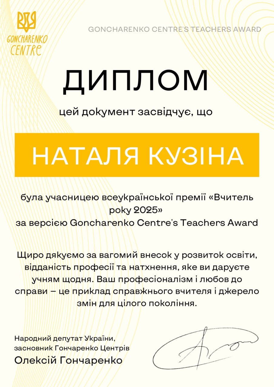 Завдяки своєму професіоналізму та вагомому внеску в освітній процес, Наталя КУЗІНА — викладачка спеціальних дисциплін, завідувачка майстерень легкої промисловості та тьюторка дитячих освітніх і творчих проєктів — успішно взяла участь у цій престижній премії! Її участь засвідчено спеціальним дипломом.