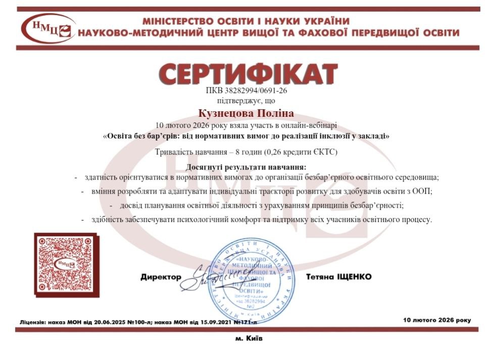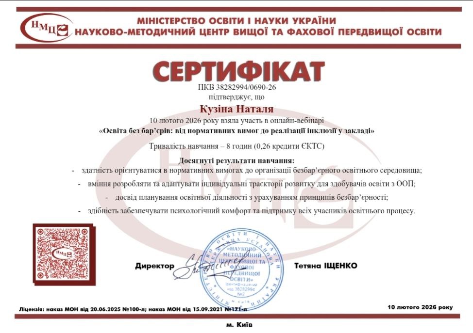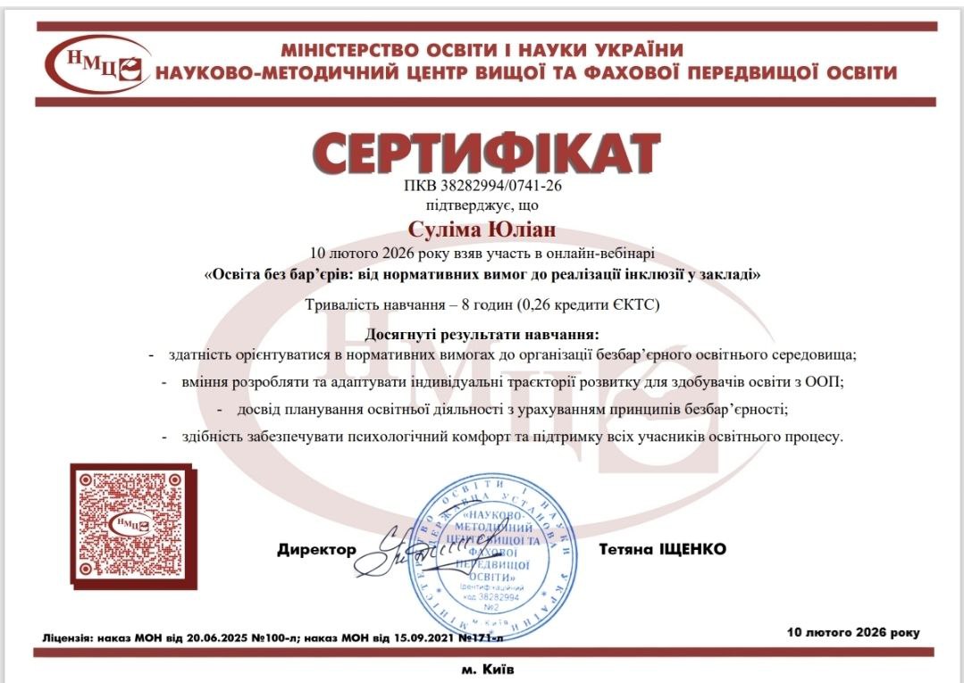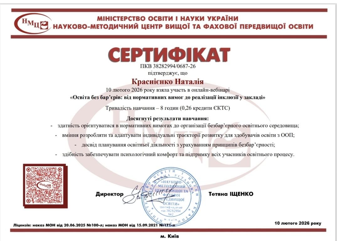 Викладачі коледжу взяли участь у онлайн-вебінарі «Освіта без бар’єрів: від нормативних вимог до реалізації інклюзії у закладі» на базі Державної установи “Науково-методичний центр вищої та фахової передвищої освіти”.