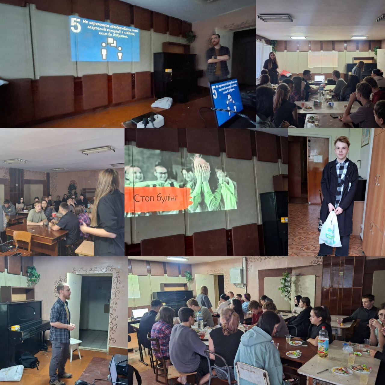 Викладач Кривченко Анастасія пояснила, що агресія — це не сила, а слабкість, і розкрила види цькування та способи його розпізнання. Обговорили юридичну відповідальність, механізми захисту та роль свідків. Джабраілов Дмитро показав соціальні відео, що глибоко розкривають тему. Жадан Артур порушив питання культури побуту в гуртожитку. Соціальний працівник Інешина Марія надала підтримку учасникам.