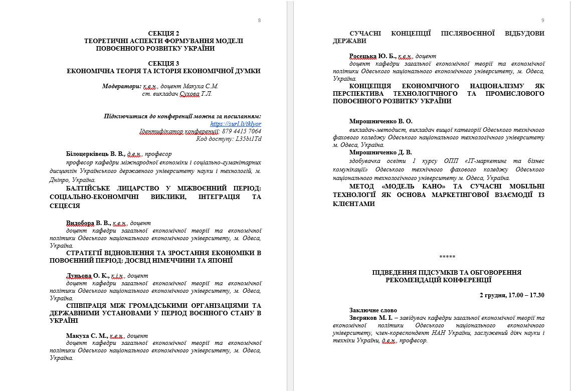 Основними напрямками роботи конференції були: 1.Сучасна економічна теорія: пріоритетні напрямки досліджень. 2.Теоретичні аспекти формування моделі повоєнного розвитку України 3.Економічна історія та історія економічної думки. 4.Наукові дослідження магістрантів спеціальності 051 «Економіка» Одеського національного економічного університету.