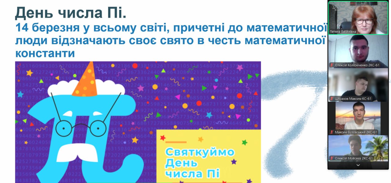 До Дня народження одного з найвідоміших чисел у світі — числа π — Качан Т.В. було проведено пізнавальний та захопливий математичний захід для студентів груп 2 КС-61, 1 ТТ...