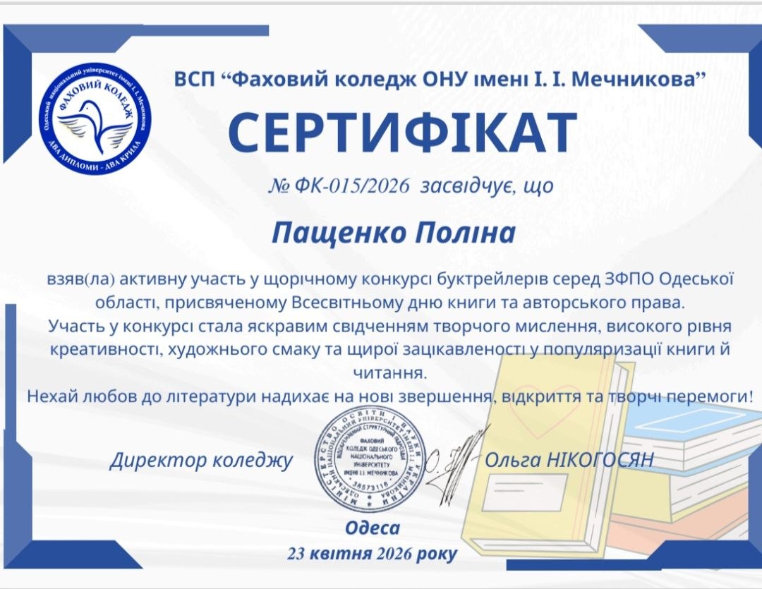 23 квітня 2026 року на базі ВСП «ОТФК ОНТУ» було проведено обласну олімпіаду з дисципліни «Основи філософських знань». За підсумками олімпіади здобувачки освіти Бурцева ...